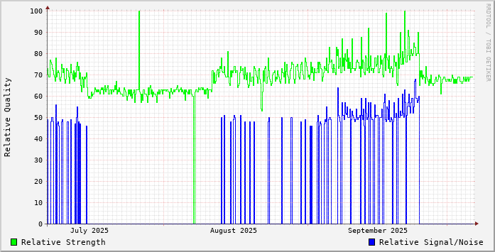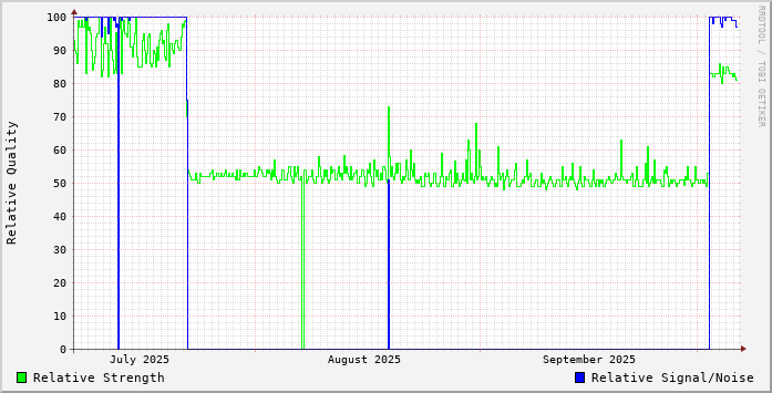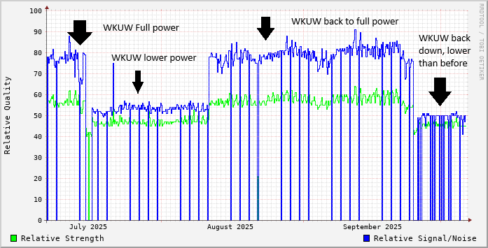 First, I would like to start with WKUW. Back on either July 14th or 15th, they went off the air only to come back on the 16th but at a lower power. Then, they went back to full power, presumably, on August 11th. Then again, on Sept. 24th, they went back to a lower power where they are currently broadcasting at. I am showing a graph of what I am talking about below. The first one is a reception graph from inside the Nashville area. The other one is my reception from 50-60 miles away from Nashville.